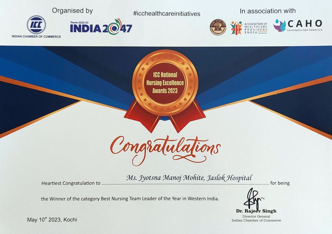 Our specialist nursing teams work in the following unitsNABH Nursing Excellence Certification : The Nursing professionals are the cornerstone of patient care in a health care organization. Keeping this in mind, We at Jaslok hospital have the certificate of Nursing Excellence conferred to us by the NABH after being assessed against set standards.It is our assurance of safe ,competent ,effective and ethical nursing care. This is achieved through our commitment to continuous quality improvement, regulation and promotion of professional nursing practice and benchmarking ourselves against the best healthcare organizations ,both nationally and internationally.